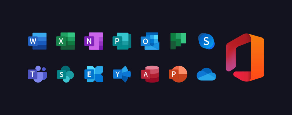 Microsoft Office 365: Word, Excel, OneNote, Sway, PowerPoint, Yammer, Outlook, Access, Publisher, SharePoint, Skype, Exchange, Teams, OneDrive. Windows 11. Editorial vector illustration